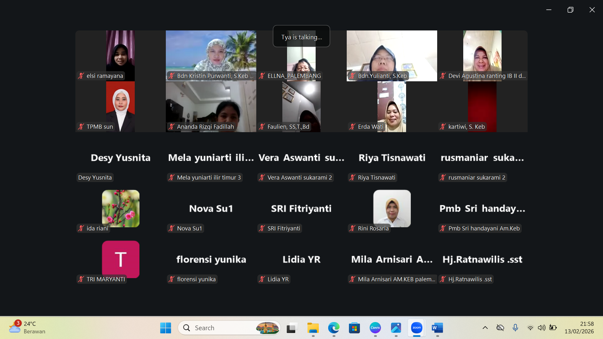 Ketua IBI Cabang Kota Palembang, Bd. Yuli Bahriah, SKM., SST., M.Kes, Bersama pengurus melaksanakan kegiatan Zoom Meeting bersama Tempat Praktik Mandiri Bidan (TPMB) pada Sabtu, 14 Februari 2026, pukul 19.30 WIB hingga selesai. Kegiatan ini diselenggarakan sebagai bentuk koordinasi, pembinaan, dan penguatan komunikasi antara pengurus cabang dan bidan praktik mandiri di Kota Palembang.